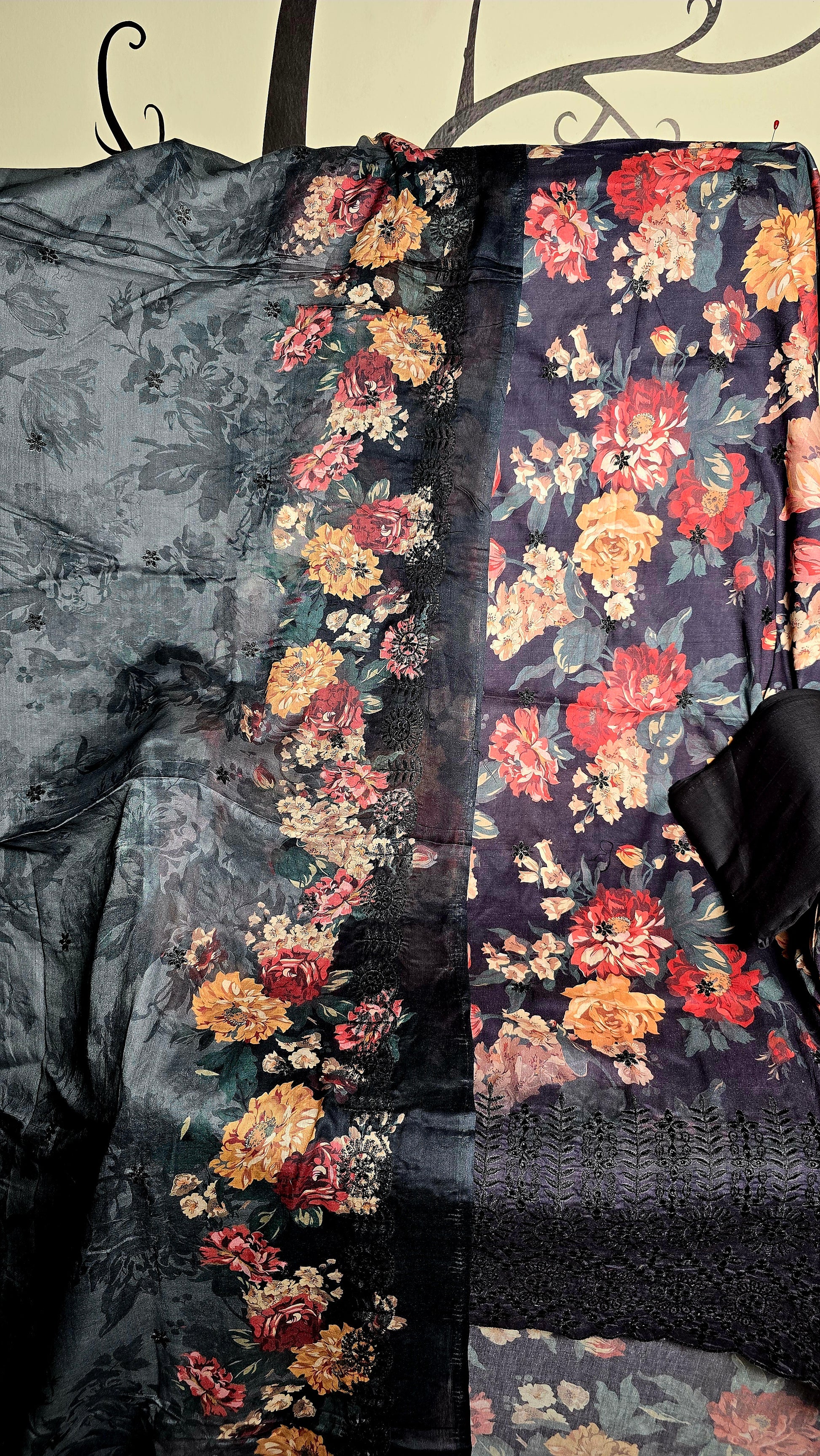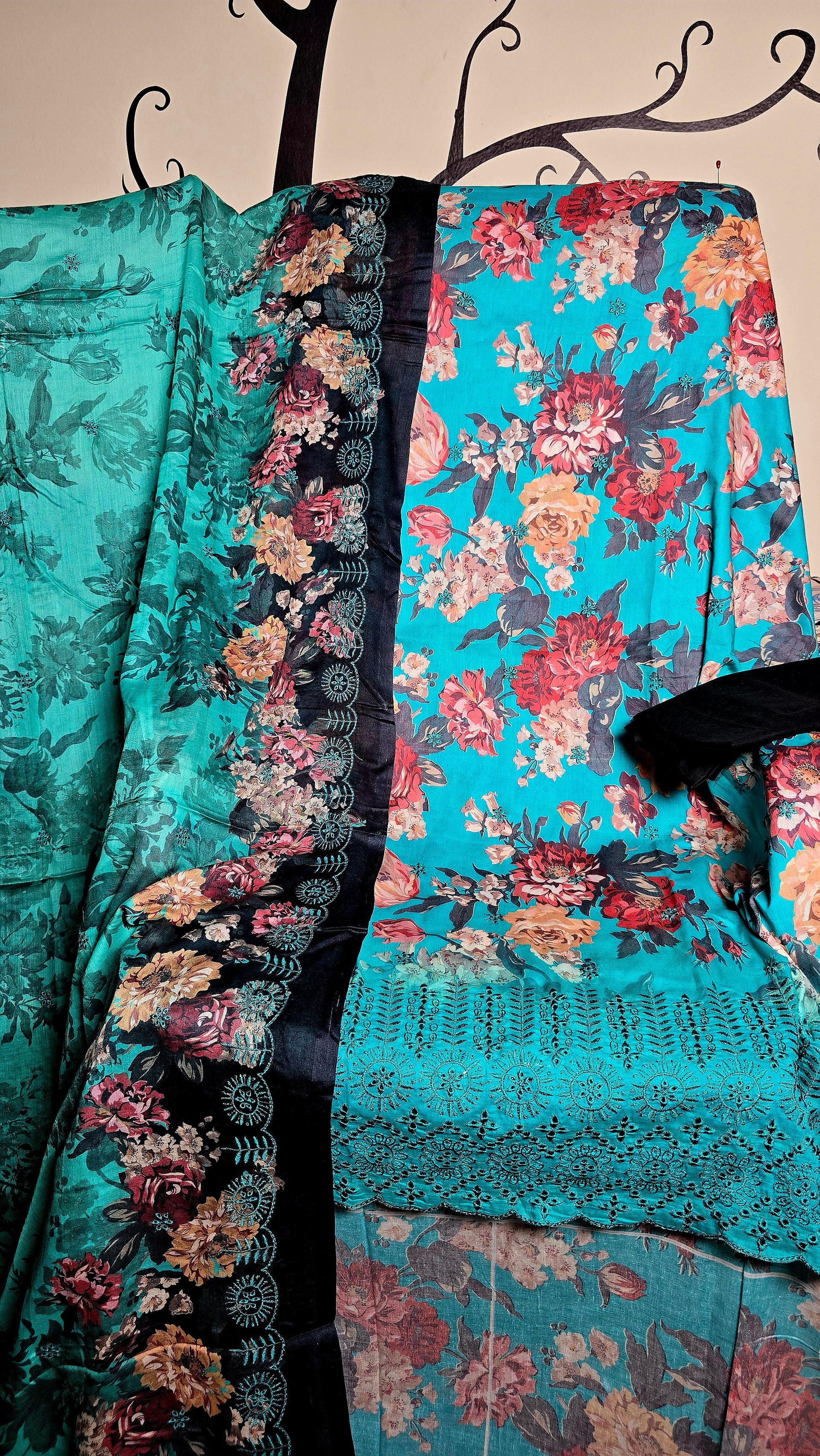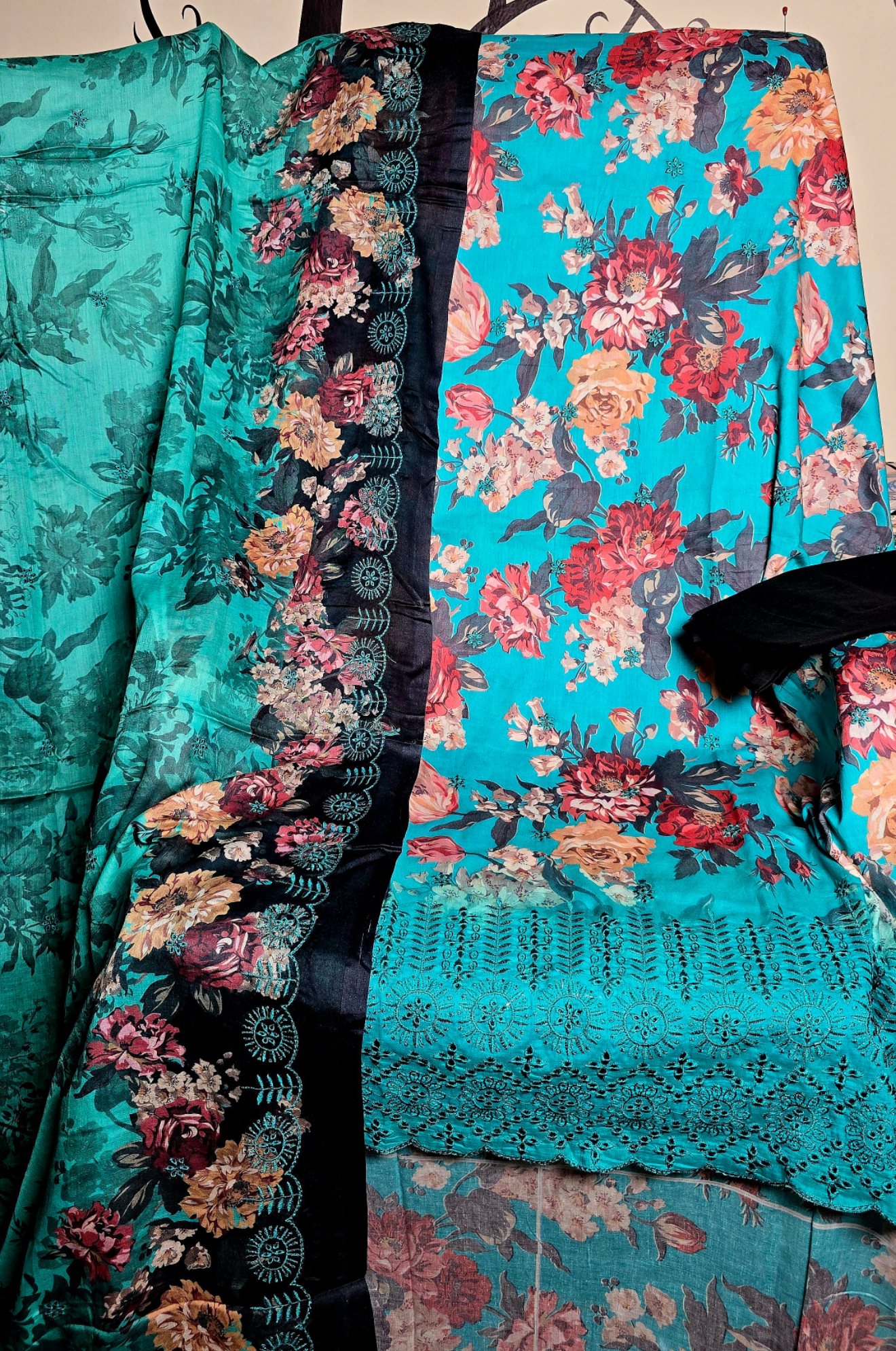 প্রিমিয়াম কোয়ালিটি সুতি ডিজিটাল প্রিন্ট এবং সিকুয়েন্স এম্ভডারি থ্রি পিচ।